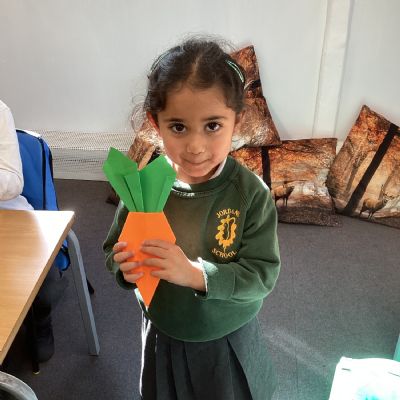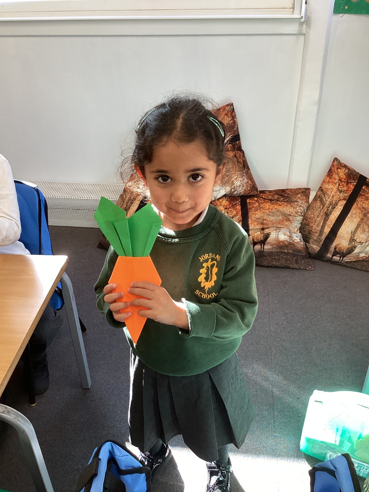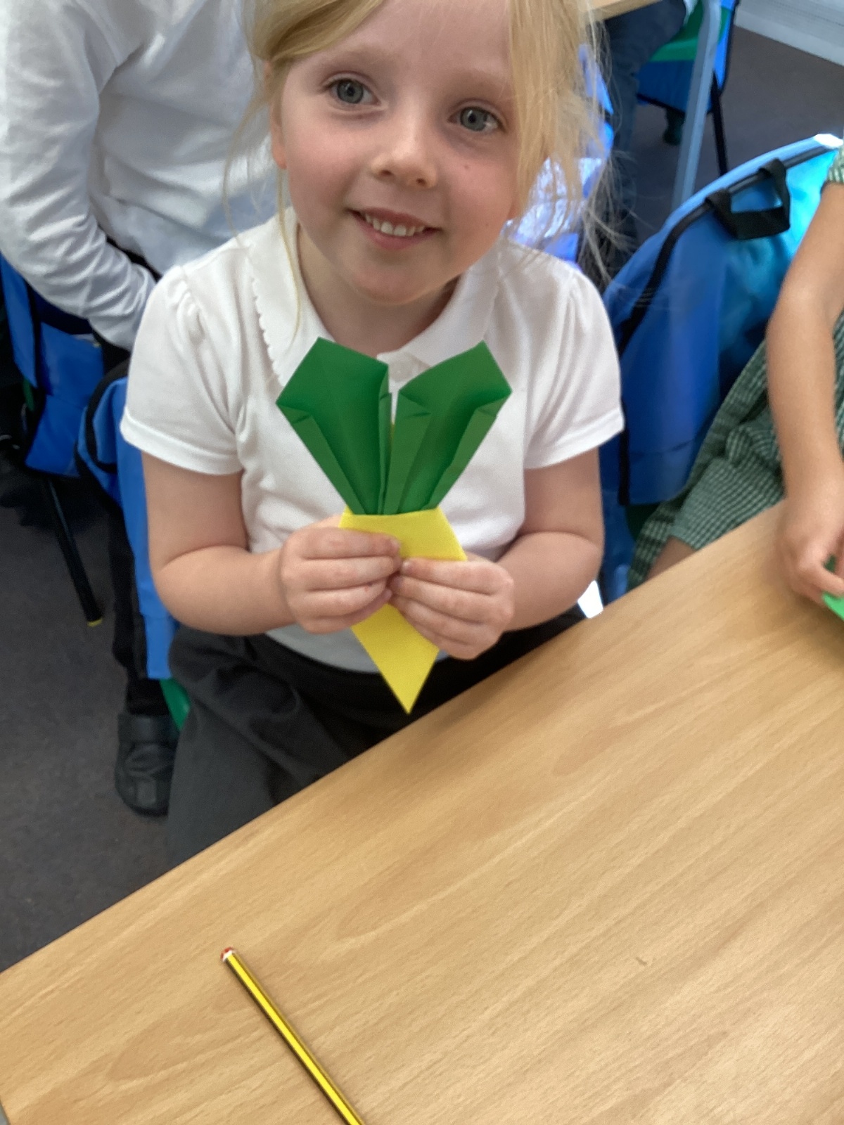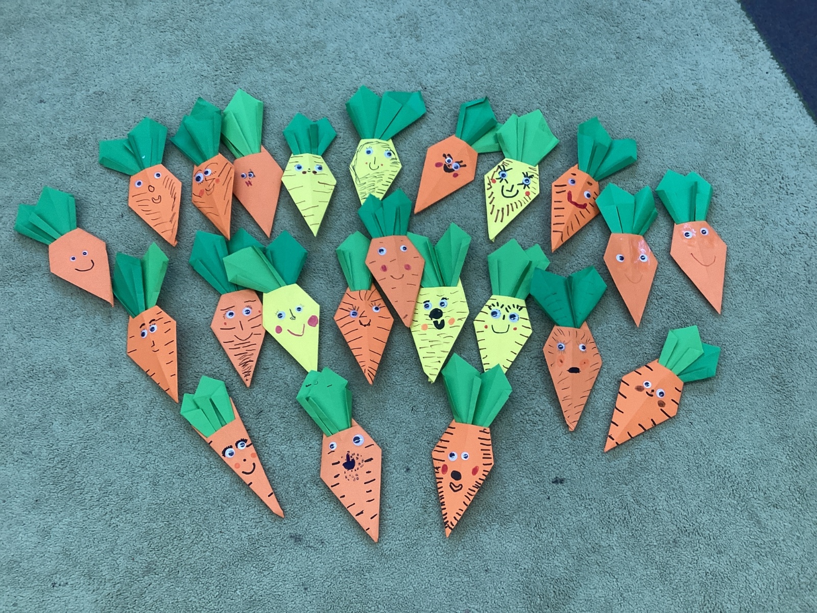In preparation for our school Harvest Assembly, we made origami carrots and parsnips! The children found the paper sculptures quite tricky to make, but they persevered. The results are impressive!