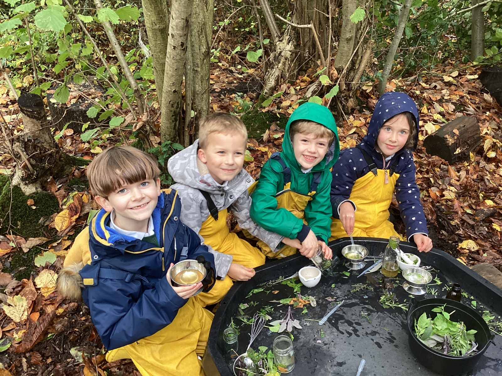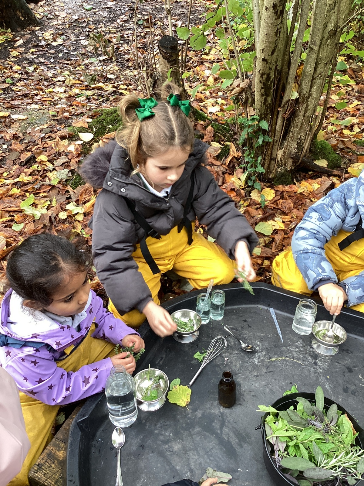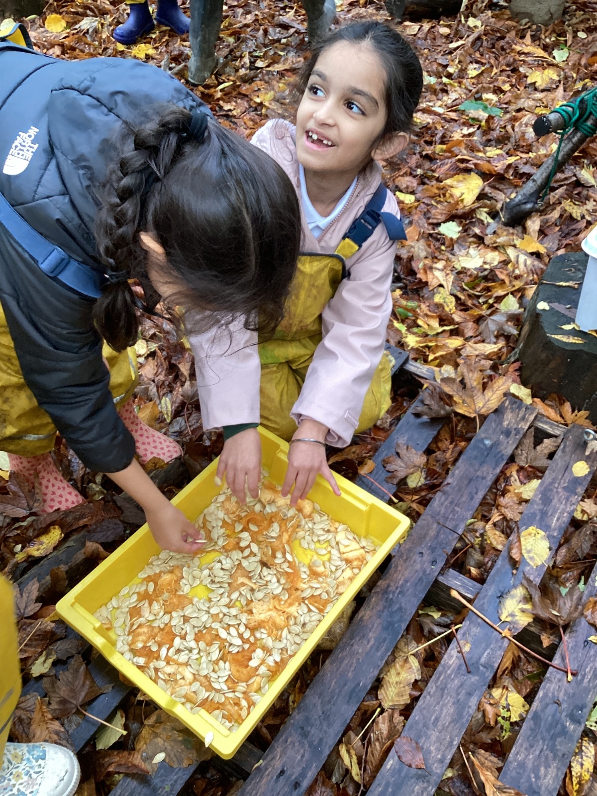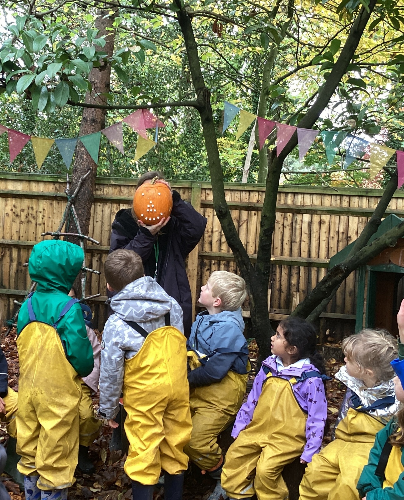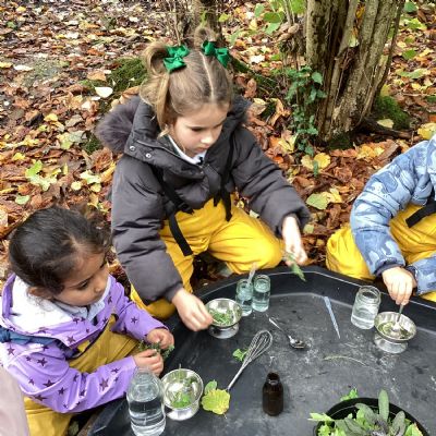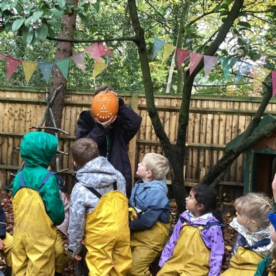In Forest School they made sweet smelling potions with rosemary and other herbs. They used mini hammers to drive pegs into a pumpkin and make a face. The insides of another pumpkin gave them a sensory experience.