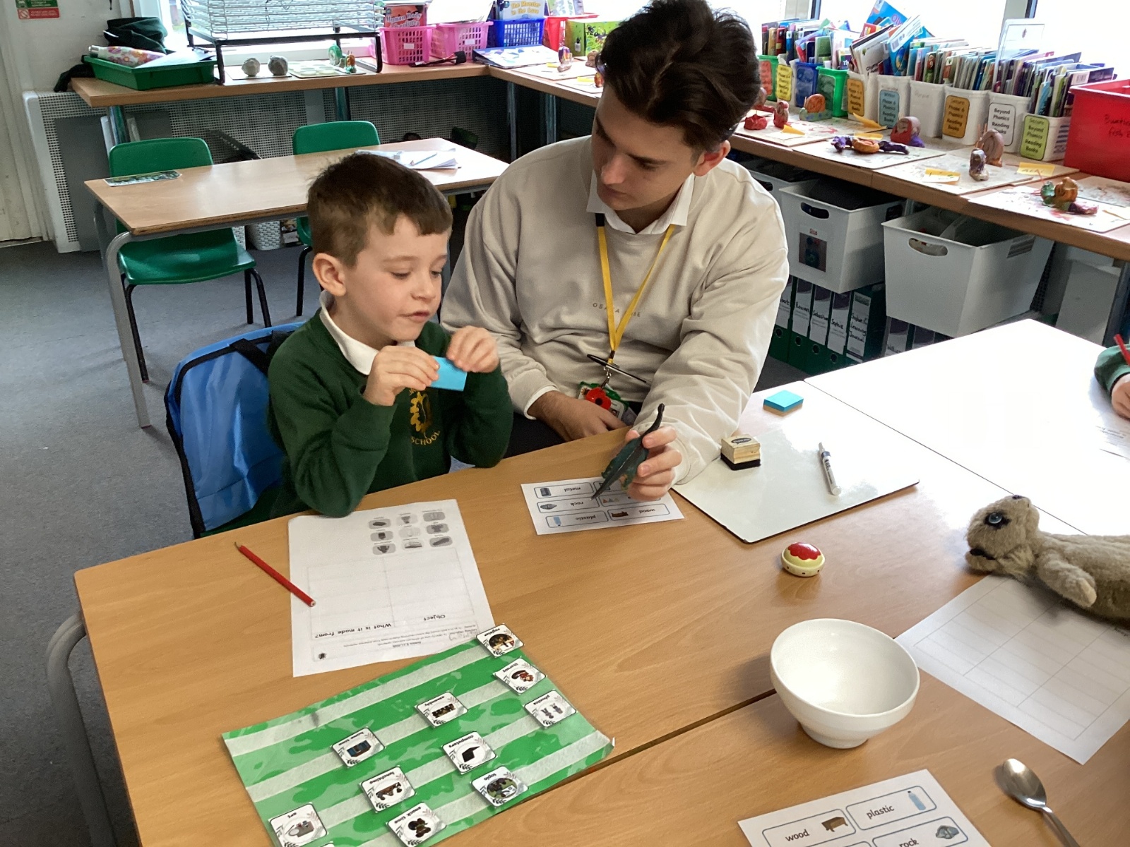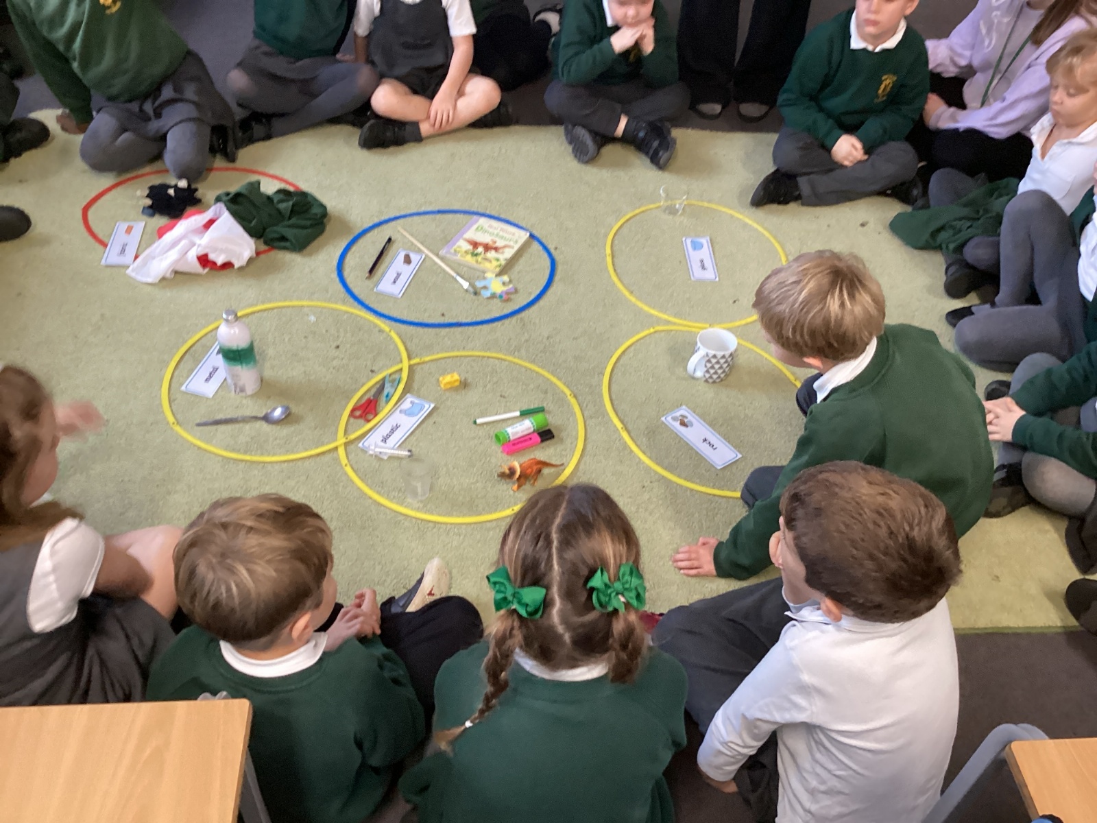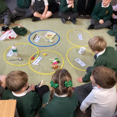 Our new science topic is 'Materials and their Uses'. The children investigated some everyday objects and decided what they were made from. They then grouped the objects into wood, metal, plastic, glass and fabric.
